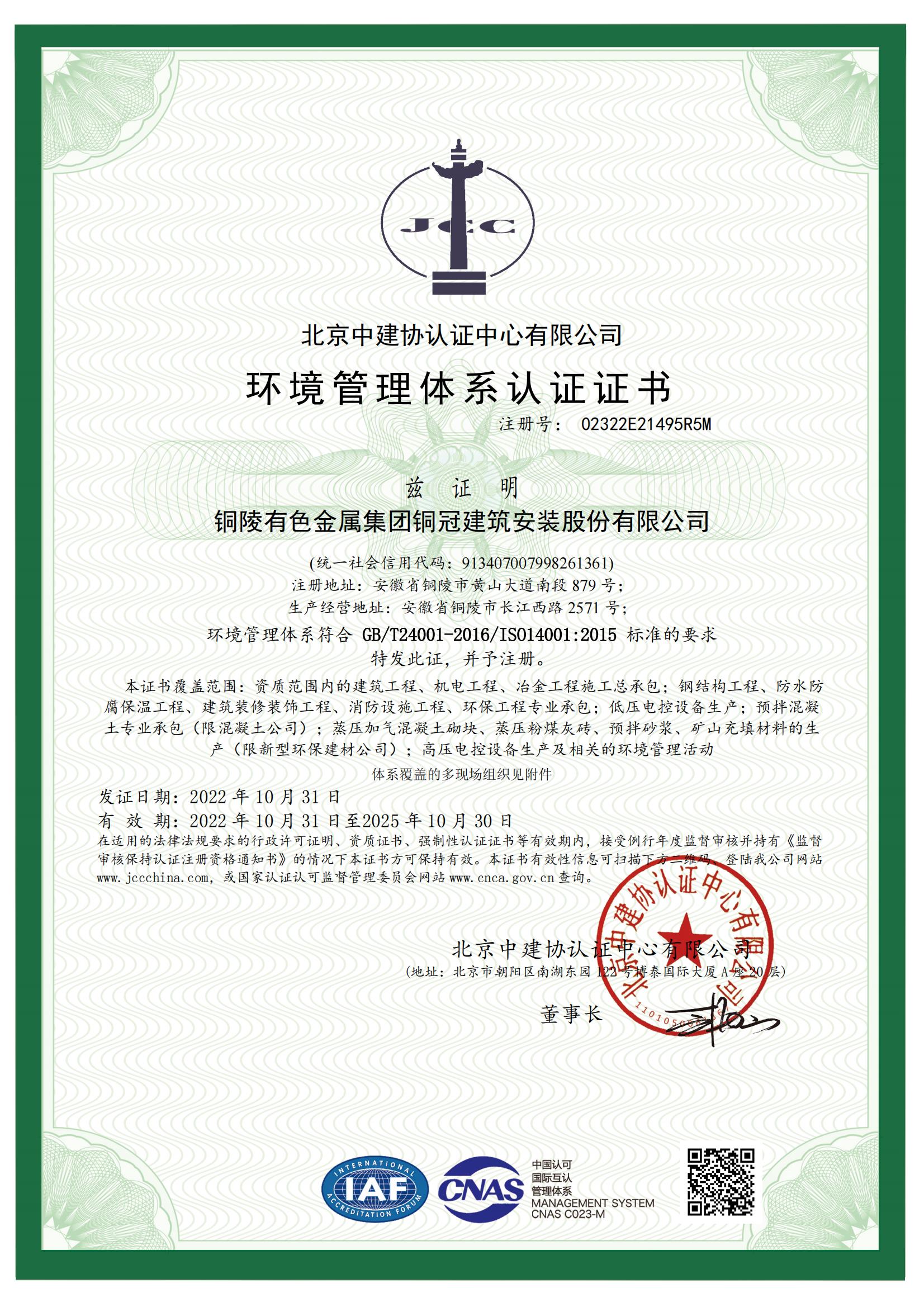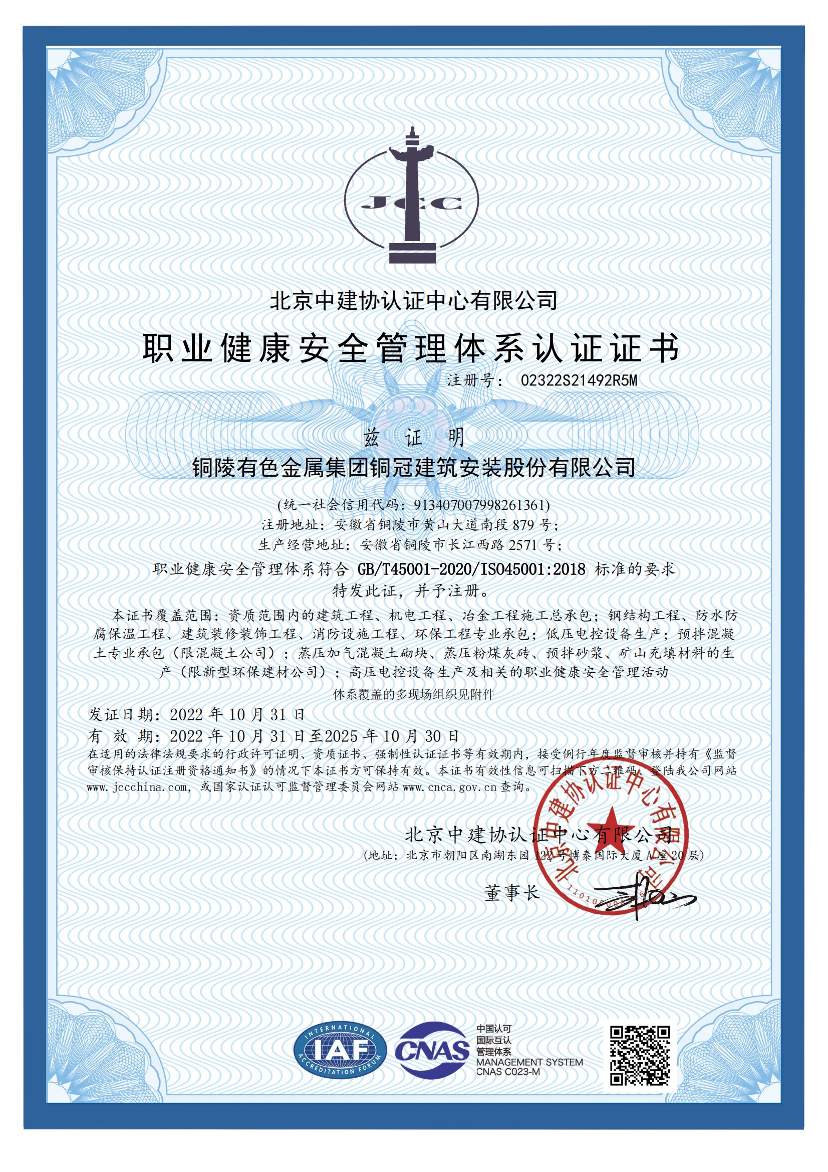 职业康健清静治理系统认证证书