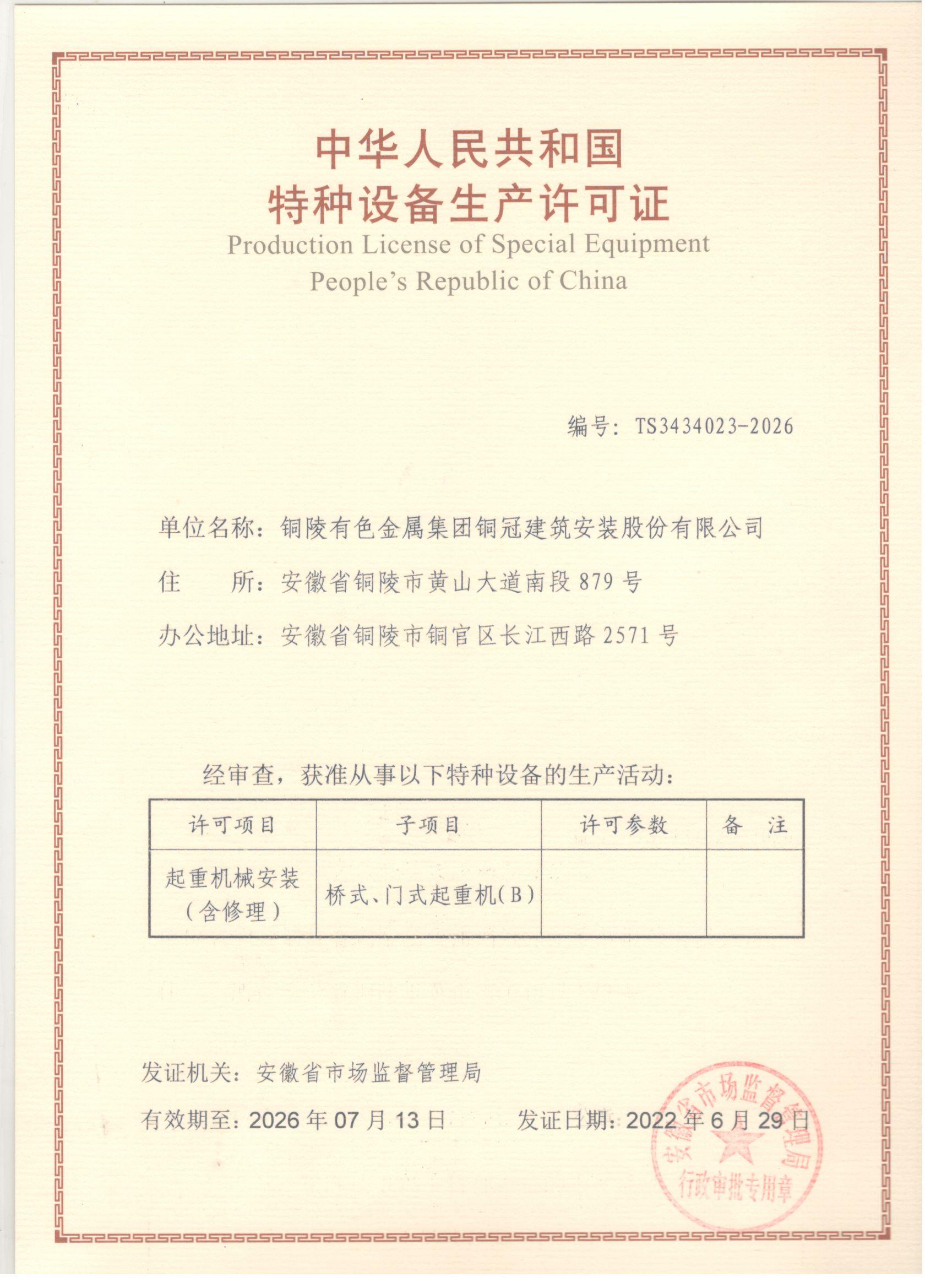 特种装备装置刷新修理允许证-起重机械