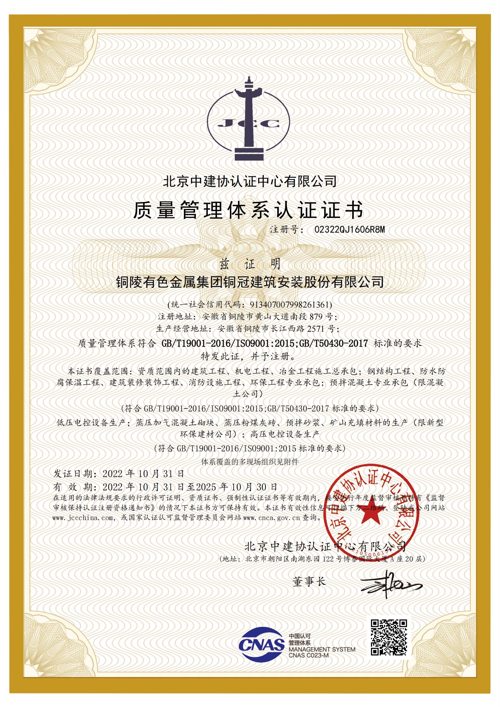质量治理系统认证证书