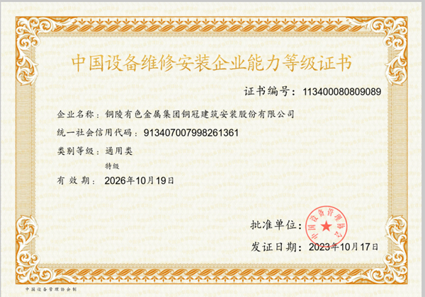 中国装备维修装置企业能力品级证书